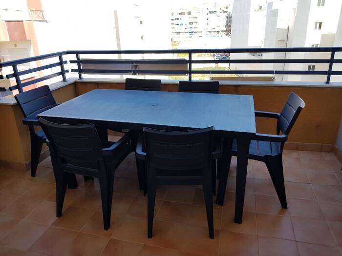 Le balcon possède une table avec ses 6 chaises ainsi qu'une armoire contenant certains objets utiles pour la plage, tels que parasols, chaises longues, bouées, etc.